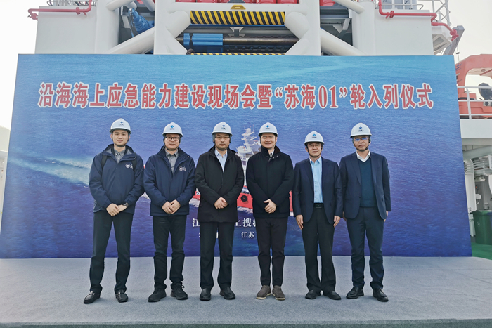 ▲參加簽約儀式的領(lǐng)導(dǎo)嘉賓共同參觀了上午剛剛?cè)刖幍摹疤K海01”輪,該輪是江蘇沿海最大馬力(12000匹)多用途應(yīng)急救援拖輪,該輪的入編填補(bǔ)了江蘇省自有大馬力拖輪應(yīng)急救援的空白。