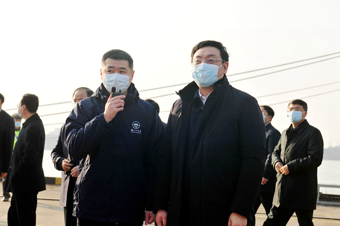 碼頭上豎起的展板上展示了新?lián)P子造船的一個個“硬核”產(chǎn)品——9150DWT電推動力油化船、全球首制的83500DWT油散化(OBO)組合兼裝船、國內(nèi)首次采用C型罐作為超大型箱船燃料罐的14000TEU雙燃料集裝箱船等,這些具有完全自主核心技術(shù)的“巨無霸”,彰顯了新?lián)P子造船的硬核實力。萬聞華市長勉勵企業(yè)持續(xù)拓展市場,推進自主創(chuàng)新,進一步鞏固企業(yè)在高科技船型設(shè)計建造領(lǐng)域的領(lǐng)先優(yōu)勢。