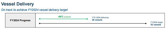 截止2024年5月24日,集團各子公司已按期(或提前)交付1800TEU、2400TEU、3300TEU、3500TEU、7000TEU雙燃料、15000TEU、16000TEU多型集裝箱船;散貨船有29800DWT、63200DWT、40000DWT、45000DWT、82000DWT、82500DWT等船型。此外交付一艘40000m3雙燃料液化石油氣/液氨運輸船,集團首次涉足的甲醇燃料動能船型——1260TEU甲醇雙燃料集裝箱船首制船也按期順利交付。截止目前,集團今年已交付新造船28艘,完成年度交付計劃63艘中的約44%。