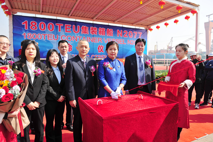 Naming and delivering the 1800TEU container ship "A KOBE" built for Dalian Zhida