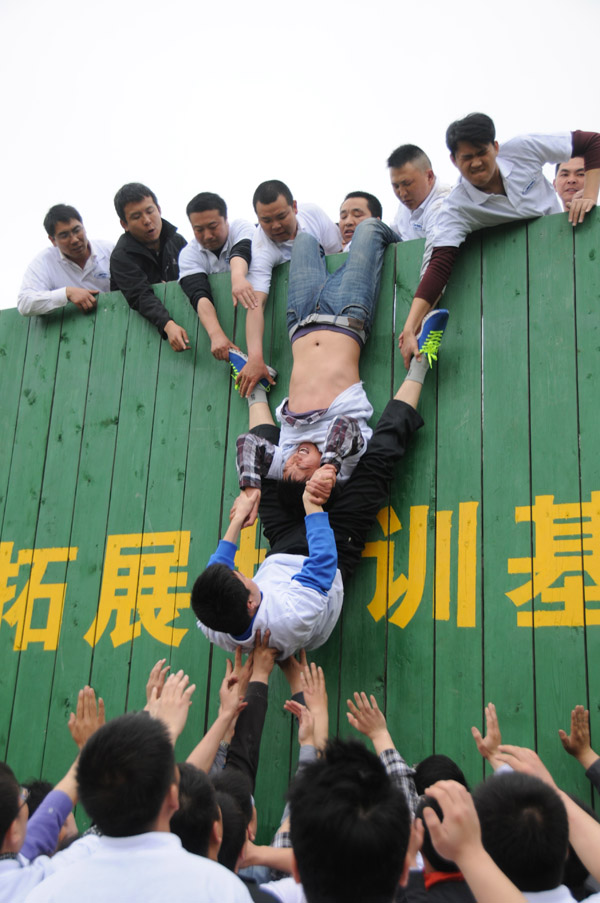 The subjects in the afternoon let them feel that success can’t be received in one day. The road towards success is a long, tiring and unceasingly transcending process. During the game of challenging the deadline of 5.4 seconds, our young cadres swore, hurt, they tried again and again and everyone cheered up when they saw their imagining 5.21 was recorded in the grade book. When it came to the last challenge, our young cadres were shocked to see the without any auxiliaries and supporting staff. They wondered that it may take about one and a half hour to climb over this 4.2-meter high wall. After a short discussion, everyone got his duties. With the guidance of the coach, they started the challenge, someone did fundamental preparations, and someone did some auxiliary work, and someone shoulder the responsibilities of protection. They took turns to do the tiring jobs. There was only one spirit in their minds that all the members should climb over it! During the process, never a complaint was heard even though someone got hurt. Just because of that spirit, can they persist and create a new record that 47 people climb over the wall within 16 minutes.