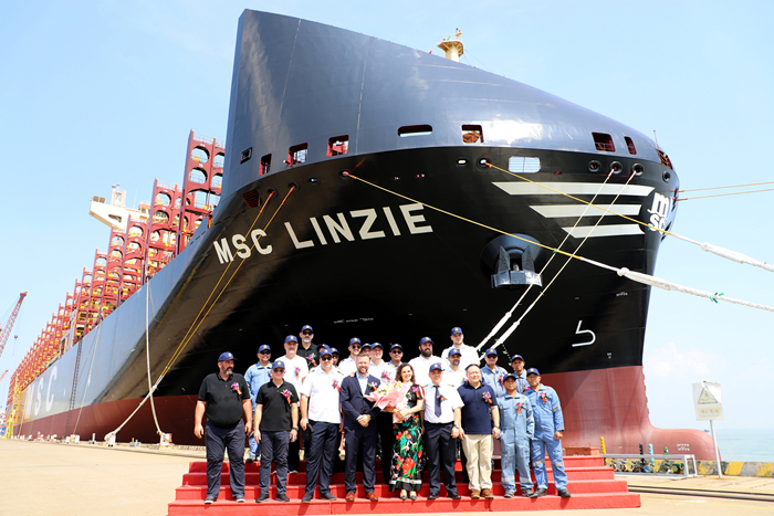 9月4日,我集團與地中海航運共同為新船舉行了命名祈福儀式。命名人Martyna Orzechowska女士,地中海航運新造船部門駐揚子鑫?,F(xiàn)場辦經(jīng)理羊海濤先生,我集團總經(jīng)理助理兼揚子鑫福造船總經(jīng)理楊雪彥先生,挪威船級社江陰站靖江部門經(jīng)理莊華平先生,以及船東監(jiān)造組、船檢、船廠、船員相關(guān)人員代表及嘉賓出席了儀式。命名人Martyna Orzechowska女士將新船命名為“MSC LINZIE”輪,為新船砍纜、擲香檳禮、拉響汽笛,并與船長共同在新船畫框上署名留念,祝福隨船船員航行平安,為船東和租家?guī)順s譽和財富。