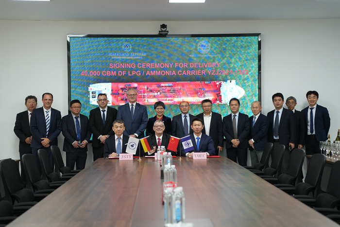 On April 12, The second 40000CBM Dual Fuel LPG/Ammonia Carrier "GASCHEM AMERICA" built by Yangzi-Mitsui Shipbuilding for German Shipowner HARTMANN was successfully signed and delivered. Our group and the HARTMANN held a grand naming ceremony for the new vessel. Ms. Ni Weifang, the godmother, named the new vessel "GASCHEM AMERICA" and tossed champagne.